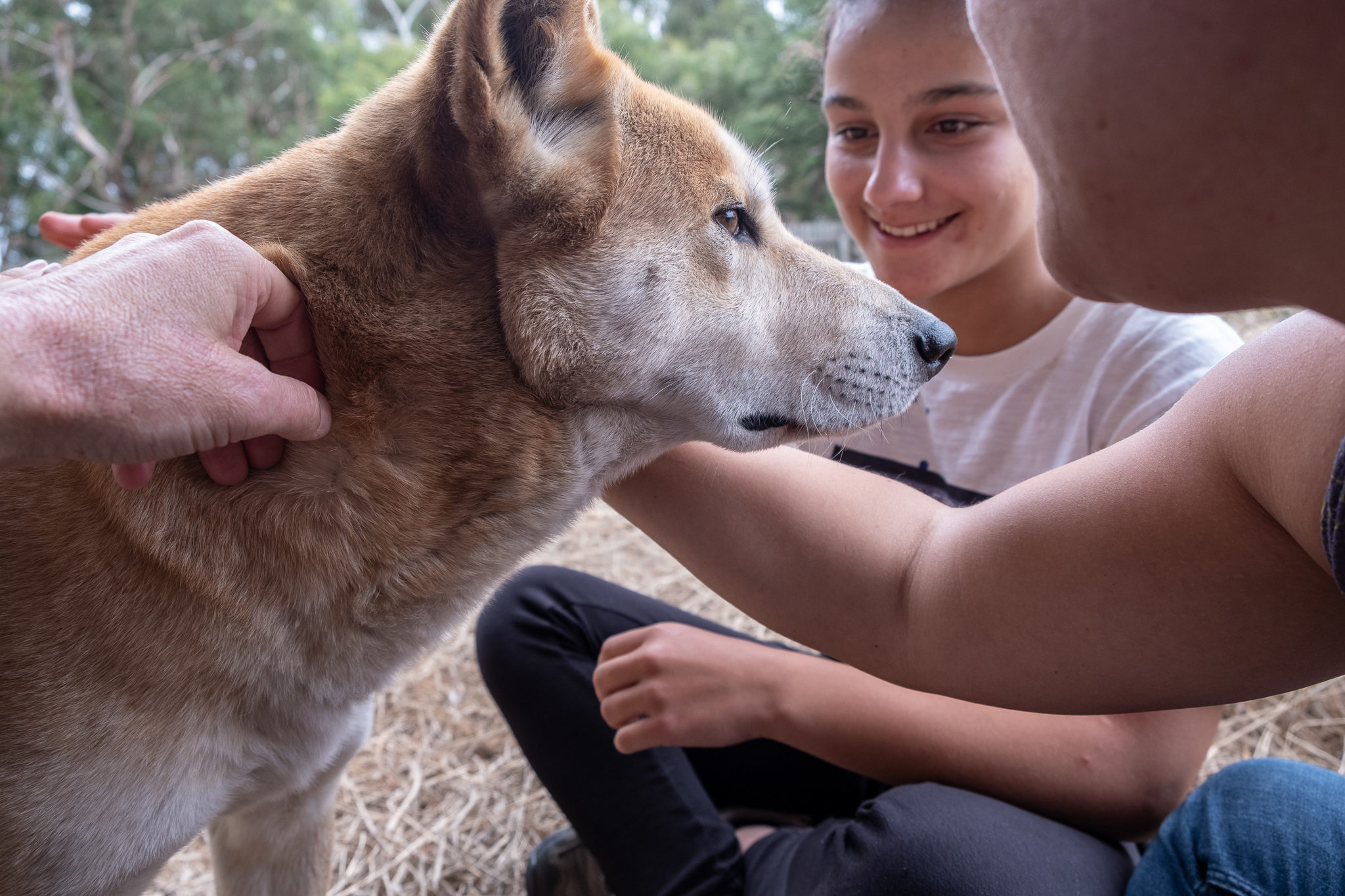Wir dürfen mit Begleitung ins Gehege und sind berührt von der ruhigen Art dieser Tiere. Wir hören keinen Laut als sich die beiden Dingos interessiert nähern, uns beschnuppern und begrüssen. Während rund einer halben Stunde erfahren wir viel Interessantes über diese wunderbaren Tiere.